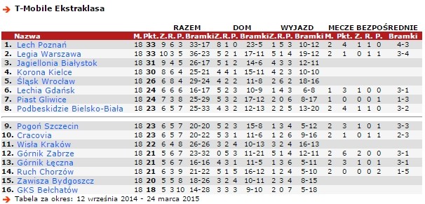 Tabela pobrana z serwisu 90minut.pl. Przedstawia klasyfikację za okres od 8. do 25. kolejki T-Mobile Ekstraklasy, a więc od pierwszego zwycięstwa Korony w obecnym sezonie (2:1 z Podbeskidziem) po wygraną z Piastem w minionej serii spotkań.