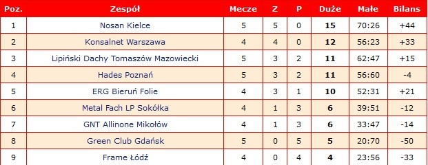 Nosan jest liderem tabeli, mając komplet 5 zwycięstw na koncie i stosunek framów +44. Na drugim miejscu jest ekipa Konsalnetu Warszawa, która również jest niepokonana, ale rozegrała o jeden mecz mniej.