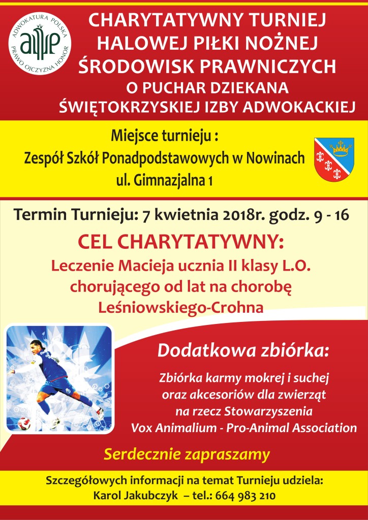 Już w sobotę odbędzie się Charytatywny Turniej Halowej Piłki Nożnej Środowisk Prawniczych o Puchar Dziekana Świętokrzyskiej Izby Adwokackiej. Do wydarzenia dojdzie w hali sportowej Zespołu Szkół Ponadpodstawowych przy ul. Gimnazjalnej 1 w Nowinach koło Kielc.
