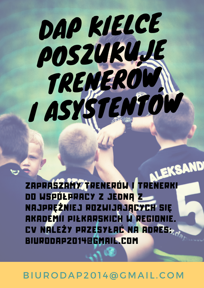 Dziecięca Akademia Piłkarska Kielce 2014 (DAP Kielce) poszukuje nowych trenerów. Szkółka piłkarska, notująca nieustanny rozwój, potrzebuje również kolejnych asystentów szkoleniowców.