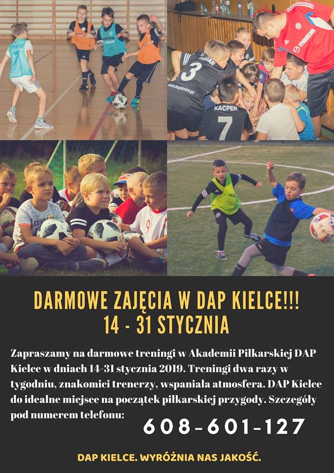 DAP Kielce to jedna z najprężniej działających szkółek piłkarskich w naszym regionie. Teraz kieruje propozycję do młodych adeptów futbolu, którzy nie są w jej szeregach na stałe. W dniach 14-31 stycznia będzie się można sprawdzić pod okiem trenerów, wykorzystując dni wolne podczas przerwy od nauki szkolnej.
