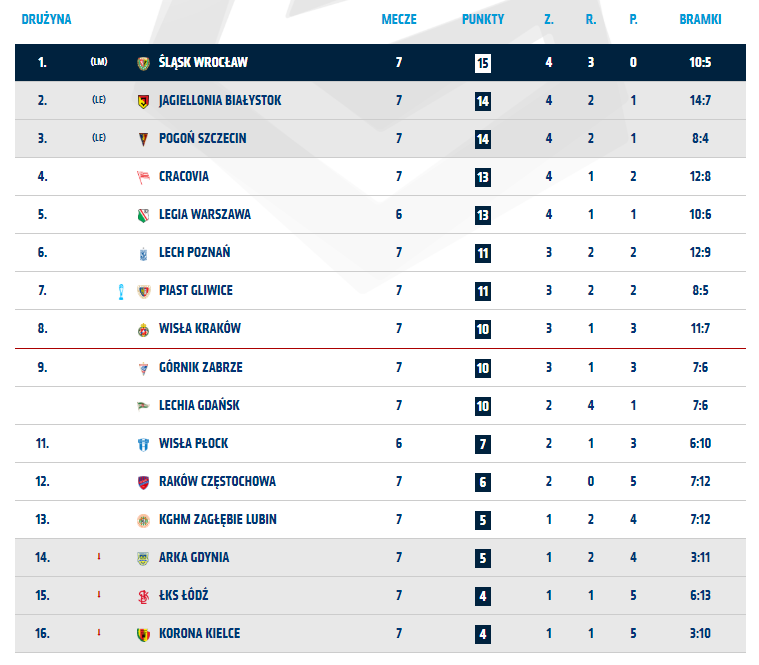 Tabela PKO Ekstraklasy po 7. kolejce. Źródło: Ekstraklasa.org
