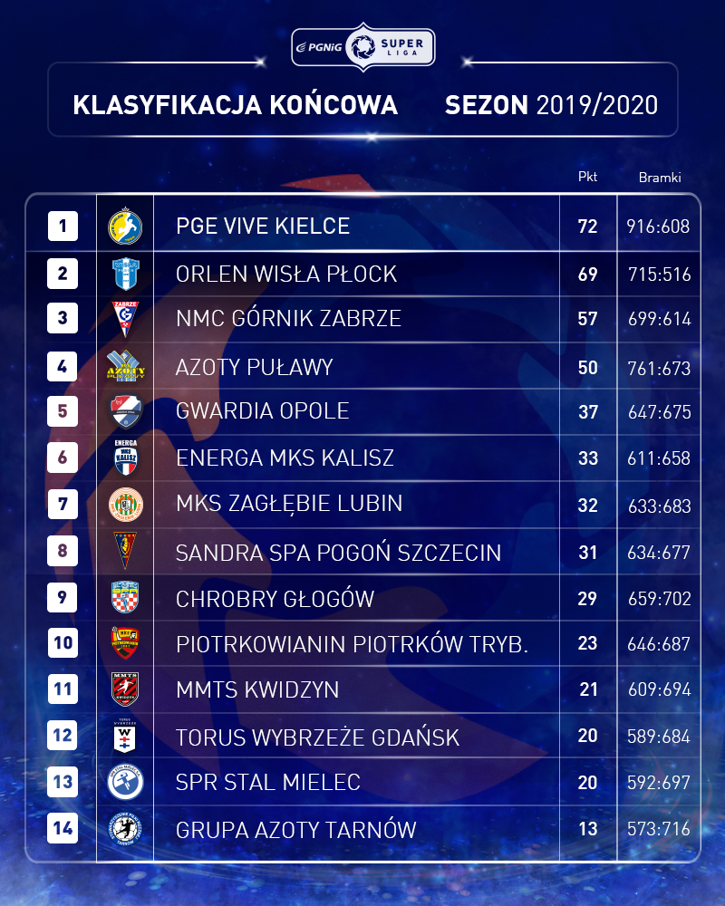 Władze PGNiG Superligi podjęły oficjalnie decyzję o przedwczesnym zakończeniu sezonu ligowego piłki ręcznej mężczyzn. Według podjętych decyzji, mistrzem Polski 2019/20 został aktualny lider, PGE VIVE Kielce! To siedemnasty triumf kielczan w rozgrywkach. Zdecydowano także o braku spadków, więc ostatnia Grupa Azoty Tarnów zostaje na kolejny sezon w elicie.