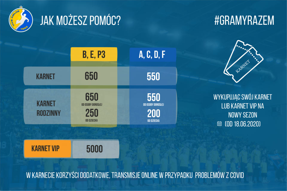 W czwartek, 18 czerwca, ruszyła już sprzedaż karnetów na domowe mecze PGE VIVE Kielce na kolejny sezon 2020/21. Od piątku karnety można też już nabywać stacjonarnie. Kielecki klub liczy, że powtórzy sukces z zeszłego sezonu i sprzeda co najmniej 1500 karnetów, które pomogą załatać dziurę budżetową. Wciąż trwa także zbiórka pieniędzy na ratowanie PGE VIVE Kielce.