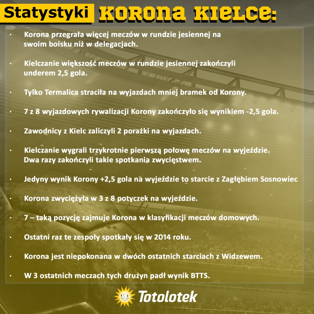 Korona Kielce w tym sezonie ligowym jest drużyną, która w meczach wyjazdowych nie traci wielu bramek. Podopieczni Macieja Bartoszka w całej rundzie jesiennej zaliczyli tylko jeden mecz w delegacji, w którym padł wynik z przynajmniej 3 golami – mowa o rywalizacji z Zagłębiem Sosnowiec. W pozostałych 7 meczach notowali under 2,5 bramki. Podobne statystyki ma Widzew Łódź, który w 5 z 7 spotkań domowych pokrywał underowe linie goli z oferty bukmachera.