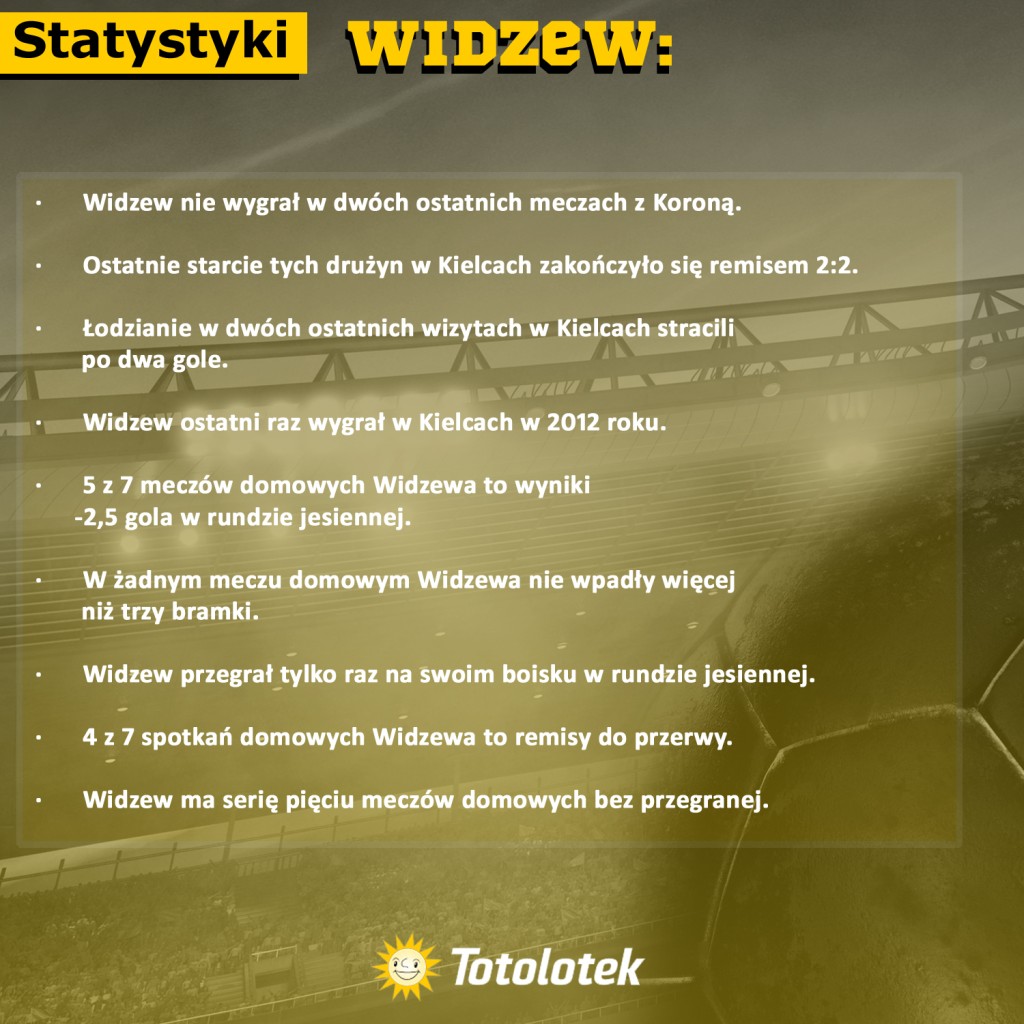 Początek sezonu na boiskach 1. Ligi nie był jednak momentem przyjemnych wspomnień. RTS został boleśnie zweryfikowany, a po zakończeniu całej rundy można jedynie stwierdzić, że drużyna zgodnie z oczekiwaniami grała tylko na swoim obiekcie, gdzie statystycznie wygrała 4 z 7 rozegranych meczów, jednak w tym przypadku można dodać jedną rywalizację, którą w teorii mają zapisaną jako wyjazd. Mowa o starciu z GKS-em Jastrzębie, które rozegrali w Łodzi – na swoim boisku – jednak zapisane zostało, jako delegacja. Takie rzeczy są możliwe tylko w polskiej piłce. 5 wygranych na 8 spotkań domowych to nie jest najgorszy wynik, dlatego nie ulega wątpliwości, że Korona nie będzie miała łatwego zadania. Jedyną porażkę na swoim obiekcie Widzew zanotował przeciwko spadkowiczowi z Ekstraklasy i derbowemu rywalowi.