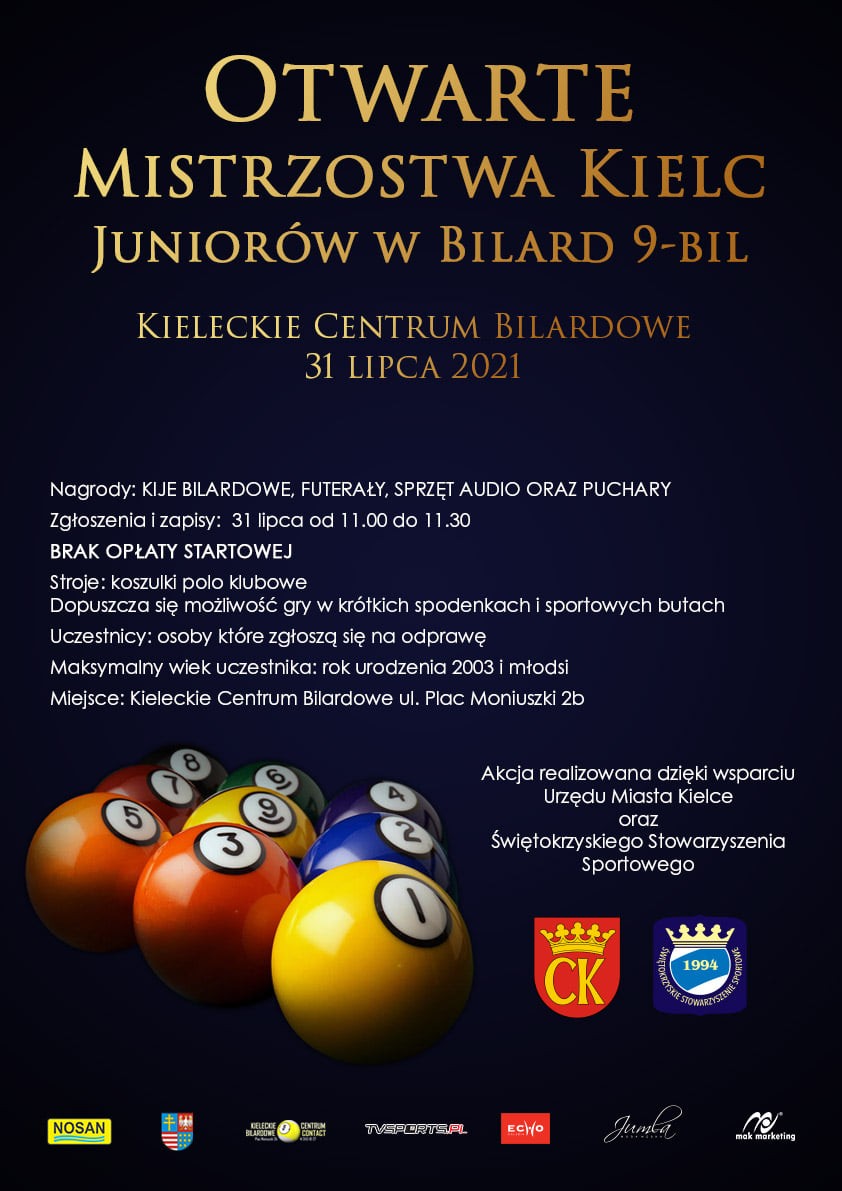 Przypominamy, że otwarte mistrzostwa juniorów odbędą się w Kieleckim Centrum Bilardowym przy ul. Plac Moniuszki 2b. Akcja realizowana jest przy wsparciu Urzędu Miasta Kielce oraz Świętokrzyskiego Stowarzyszenia Sportowego.