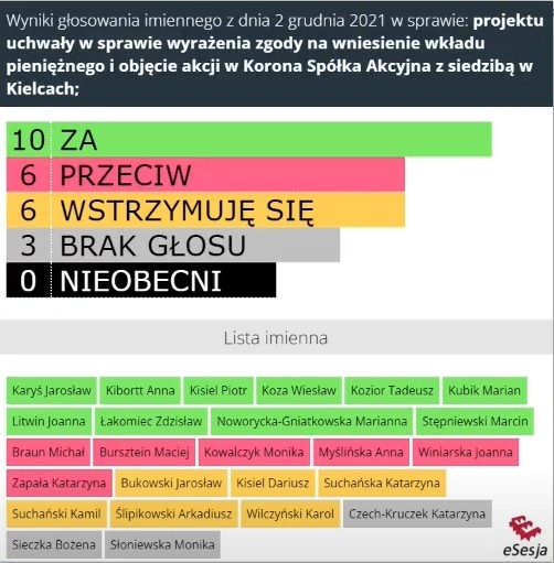 Za podjęciem tej uchwały było dziesięć osób, przeciwnych było sześciu rajców, kolejnych sześć wstrzymało się od głosu, zaś trzy głosu nie oddały.