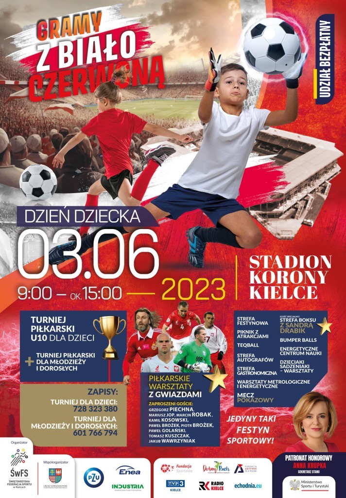 Dzień dziecka pod hasłem „Gramy z Biało-Czerwoną” to wydarzenie pod Patronatem Wiceminister Sportu Anny Krupki, które współorganizowane jest przez Świętokrzyską Federację Sportu, Urząd Marszałkowski Województwa Świętokrzyskiego a także organizacje trzeciego sektora: Fundację Dobry Ruch, Fundację Sportową, Fundację Aktywni dla Polski oraz Stowarzyszenie Wczoraj, Dzisiaj i Jutro. Partnerem wydarzenia jest Świętokrzyska Grupa Przemysłowa Industria, a sponsorem generalnym PZU. Wsparcia udzieliła także Enea Elektrownia Połaniec oraz Ministerstwo Sportu i Turystyki.