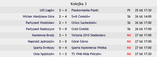 Po tej serii gier bez ligowego zwycięstwa pozostają zespoły Wichra Miedziana Góra i Victorii Skalbmierz. Na pierwsze punkty muszą poczekać przynajmniej do soboty, bo wtedy startuje 4. kolejka Klasy Okręgowej.