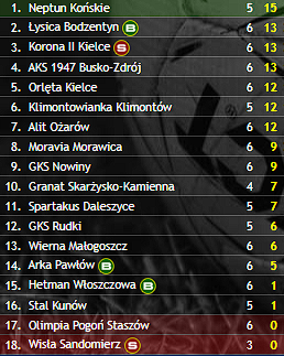 Na sobotę zaplanowane były trzy spotkania. Jako pierwsi swój pojedynek stoczyli gracze Granatu Skarżysko-Kamienna i Alitu Ożarów. Alit po dobrym początku przegrał drugi mecz z rzędu, ulegając drużynie ze Skarżyska 1:4. W sobotę swoje spotkanie rozegrał także inny zespół, który zaliczył dobry start w rozgrywkach ligowych, AKS 1947 Busko-Zdrój. Drużyna prowadzona przez Marcina Kołodziejczyka także uległa niżej notowanemu w tym sezonie GKS-owi Nowiny 2:4.