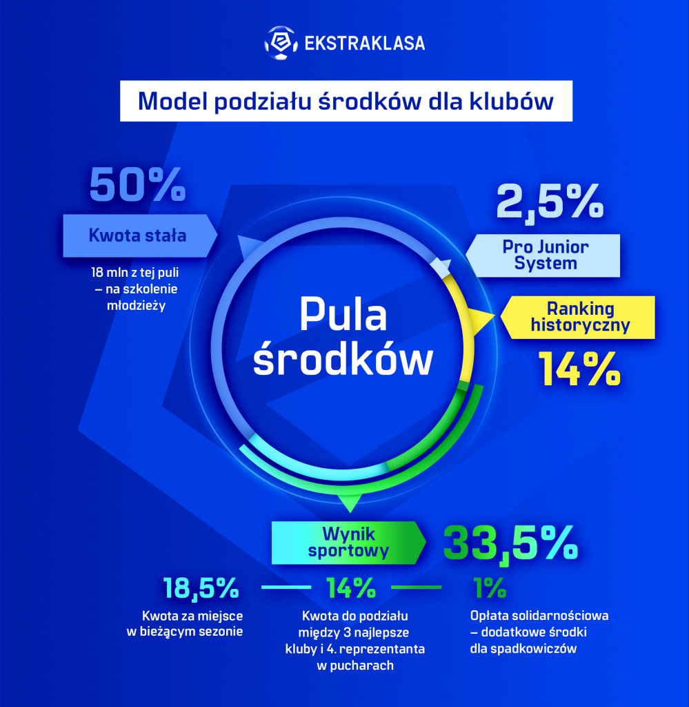 Środki dla klubów po zakończeniu sezonu zostaną podzielone według tego samego modelu, jaki zastosowano w ubiegłym sezonie. Połowa z 280 milionów złotych to kwota stała, według wyników sportowych bieżącego sezonu zostanie rozdysponowane 33,5% pieniędzy, a 14% według rankingu historycznego. Pozostałe 2,5% to część, którą Ekstraklasa przekaże na program Pro Junior System.