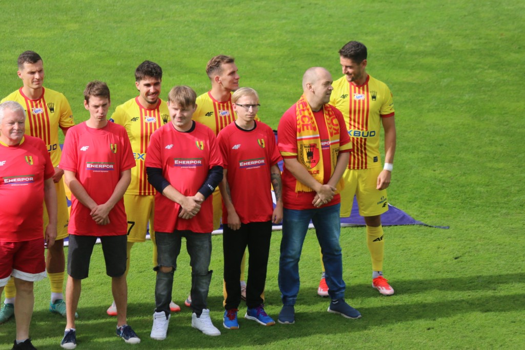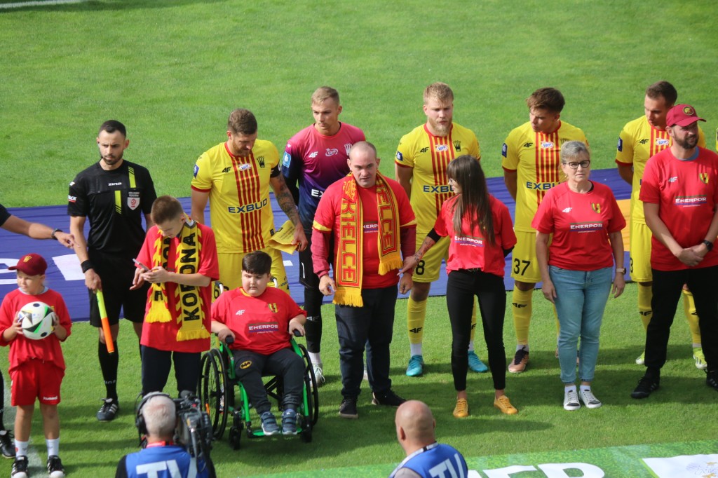 Niepełnosprawni kibice Korony Kielce wyprowadzili piłkarzy na mecz z Zagłębiem Lubin. To część ogólnopolskiej akcji stadiony bez barier oraz efekt współpracy „żółto-czerwonych” z Klubem Kibiców Niepełnosprawnych Kielce.