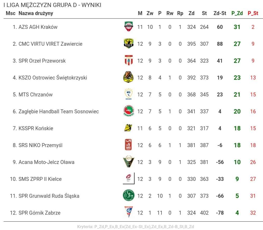 Tabela po 14. kolejce I ligi grupy D: