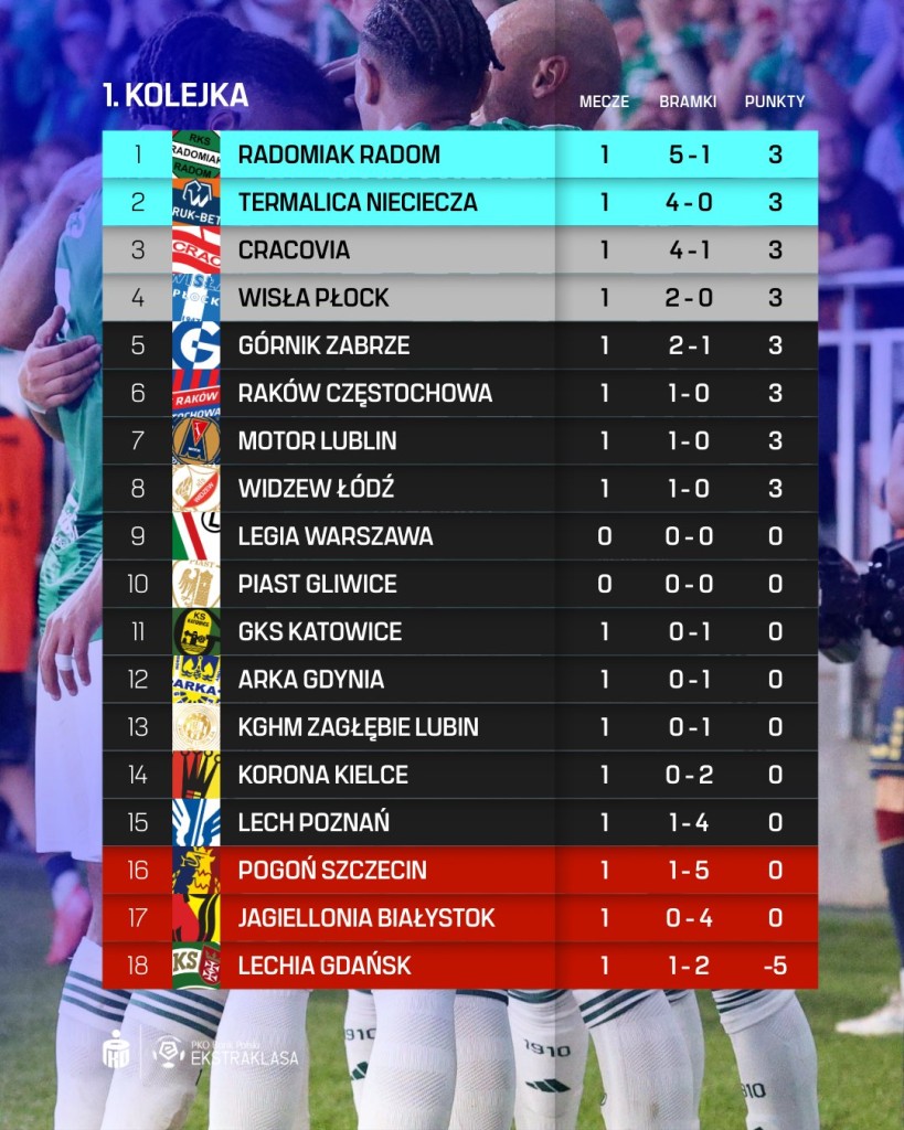 Tabela po 1. kolejce PKO BP Ekstraklasy:
