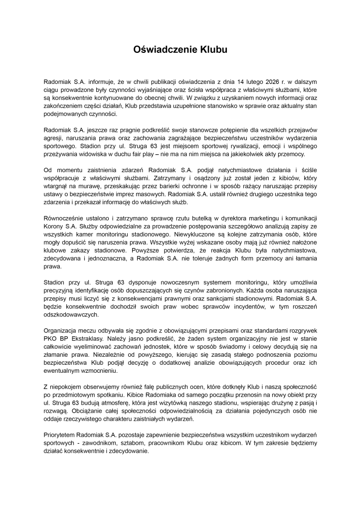 W oświadczeniu podkreślono, że Radomiak stanowczo potępia wszelkie przejawy agresji i zachowania zagrażające bezpieczeństwu uczestników imprezy masowej. Jak zaznaczono, stadion przy ul. Struga 63 ma być miejscem sportowej rywalizacji i emocji w duchu fair play, bez miejsca na przemoc.