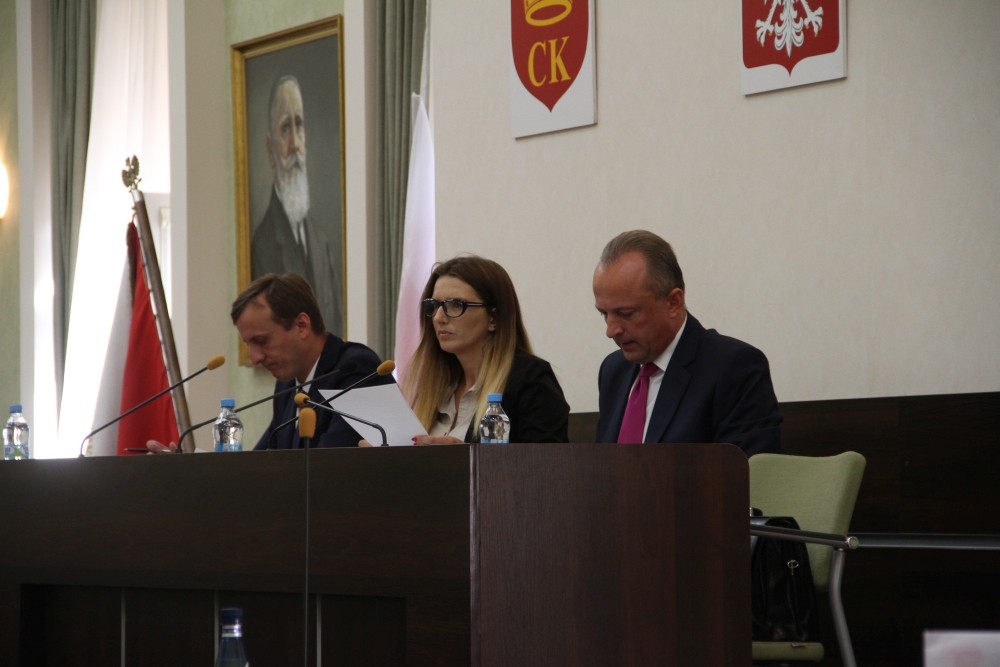 Prezydium Rady Miasta: od lewej Dawid Kędziora (PSL), przewodnicząca Joanna Winiarska (PO) i Krzysztof Adamczyk (SLD).