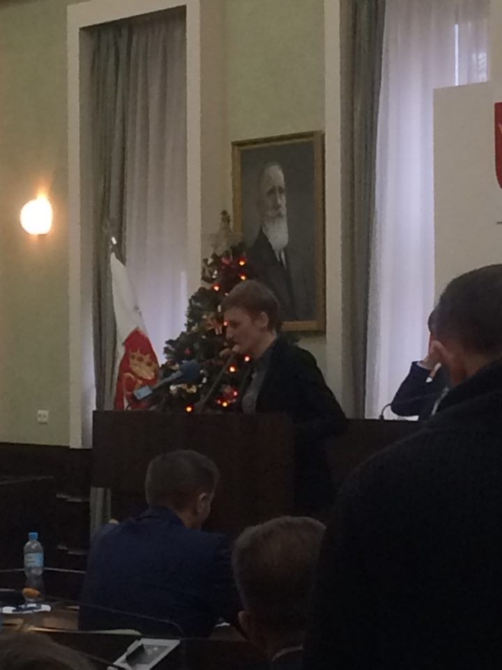 Dawid Kędziora z PSLu odczytuje uchwały RIO w sprawie opinii o projekcie budżetu Miasta Kielce na 2016 rok. Na temat Korony ciągle czekamy.