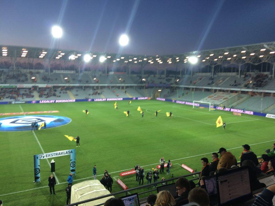 Zamieszanie pod naszą bramką, był rzut rożny. Dogrywał odbitą piłkę Mączyński, ale to wybili jeszcze kielczanie. Po chwili jeszcze kolejne dośrodkowanie, ale niecelne.