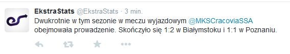 Na razie jednak wiele się nie dzieje. Bez okazji, bez groźnych sytuacji. Aha, w Cracovii od 1. minuty na boisku są Krzysztof Nykiel i Krzysztof Pilarz, byli piłkarze Korony. I jest Mateusz Żytko, testowany kiedyś przez Koronę. Testy oblał.