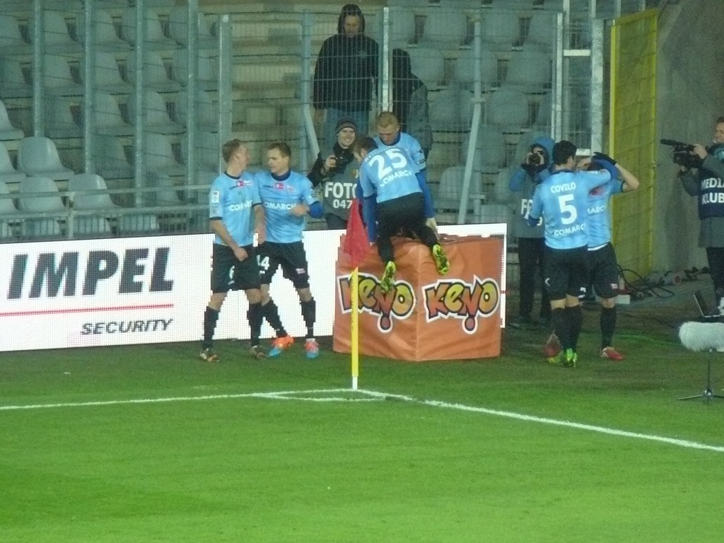 Jest źle. Bardzo źle. Prostopadłe podanie z głębi pola do Budzińskiego, ten staje "oko w oko" z Cernkiauskasem i... pokonuje golkipera Korony. Zachowuje zimną krew i uderza obok bramkarza kielczan. Gol.