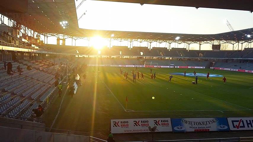 A dzisiaj w Kielcach zimno, około 0 stopni, ale w sumie to bardzo przyjemnie. Ładne, bezchmurne niebo, słoneczko - idealne warunki do gry w piłkę. Narzekać nie mamy prawa, chociaż... Jak usiedliśmy na trybunach, to tyłki mogą zmarznąć ;)