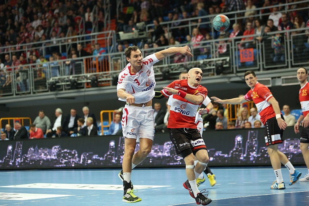 Karol Bielecki potężnie rzuca z drugiej linii. Po chwili kolejna kontra Polski, rzucał Gumiński.