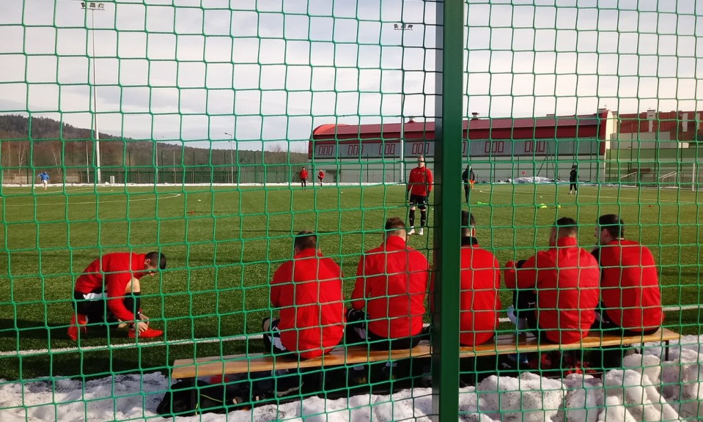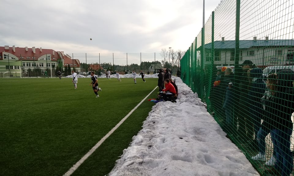 Takie mamy dzisiaj warunki :) Kibice oglądają spotkanie zza siatki, media na śniegu :) A sztab szkoleniowy obserwuje piłkarzy zza linii bocznej boiska.