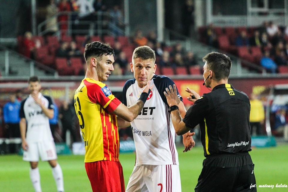Rzut karny dla Wisły Kraków... Mateusz Spychała nieodpowiedzialnie fauluje pod linią końcową boiska... Zupełnie niepotrzebne zagranie...