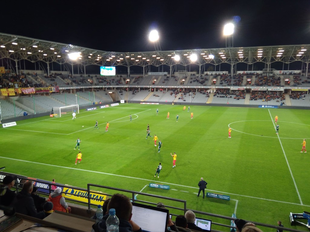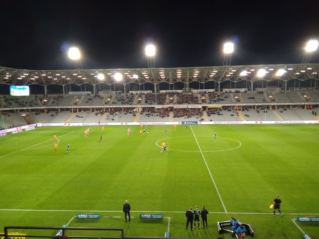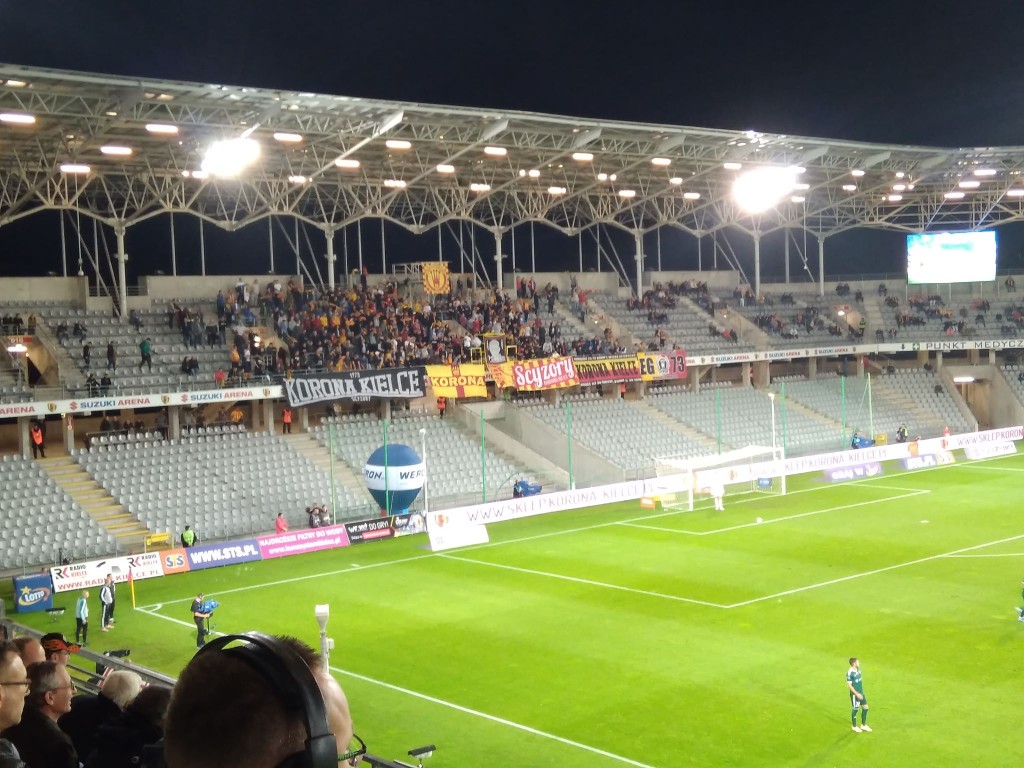 Pytacie o fotkę trybun i taka zaraz się pojawi. A na razie zerkamy na boisko - wyrównana gra, Korona mocno zaangażowana i starająca się kreować okazje. Od początku to kielczanie częściej utrzymują się przy piłce.