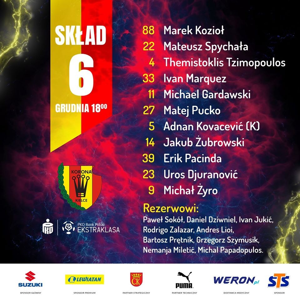 Dziś w składzie Korony Kielce mnóstwo zmian, ale to roszady spowodowane kontuzjami. Wirus wykluczył z gry Marcina Cebulę, natomiast poobijani są Michal Papadopulos i Andres Lioi, dlatego rozpoczną mecz na ławce. Nie ma też zapowiadanych Ognjena Gnjaticia i Milana Radina.