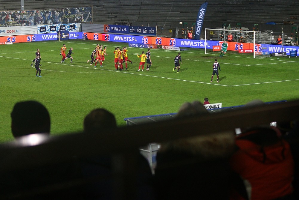 Jest zamieszanie. Miletić leży. Ale szczerze mówiąc jesteśmy tak usytuowani na trybunach, że nie widzimy, co się dzieje przy linii bocznej, ale chyba jest OK. Miletić gra dalej. Korona gra dalej, a Pogoń próbuje coś strzelić.