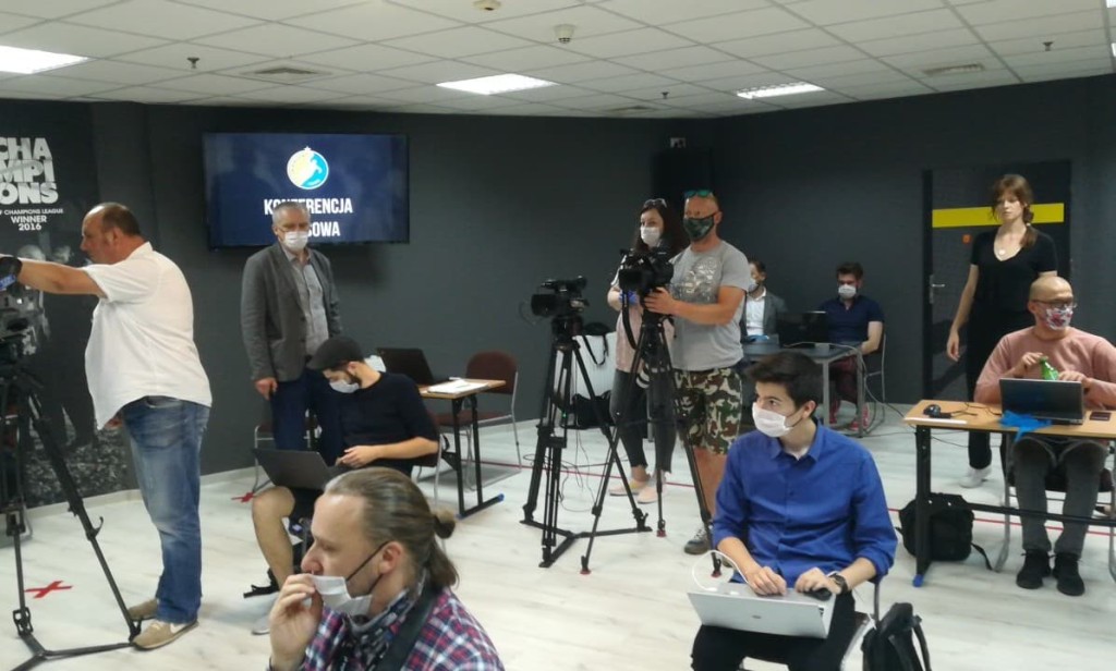 Ostatnie przygotowania. Dziennikarze oczywiście z maseczkami, taki czas mamy.