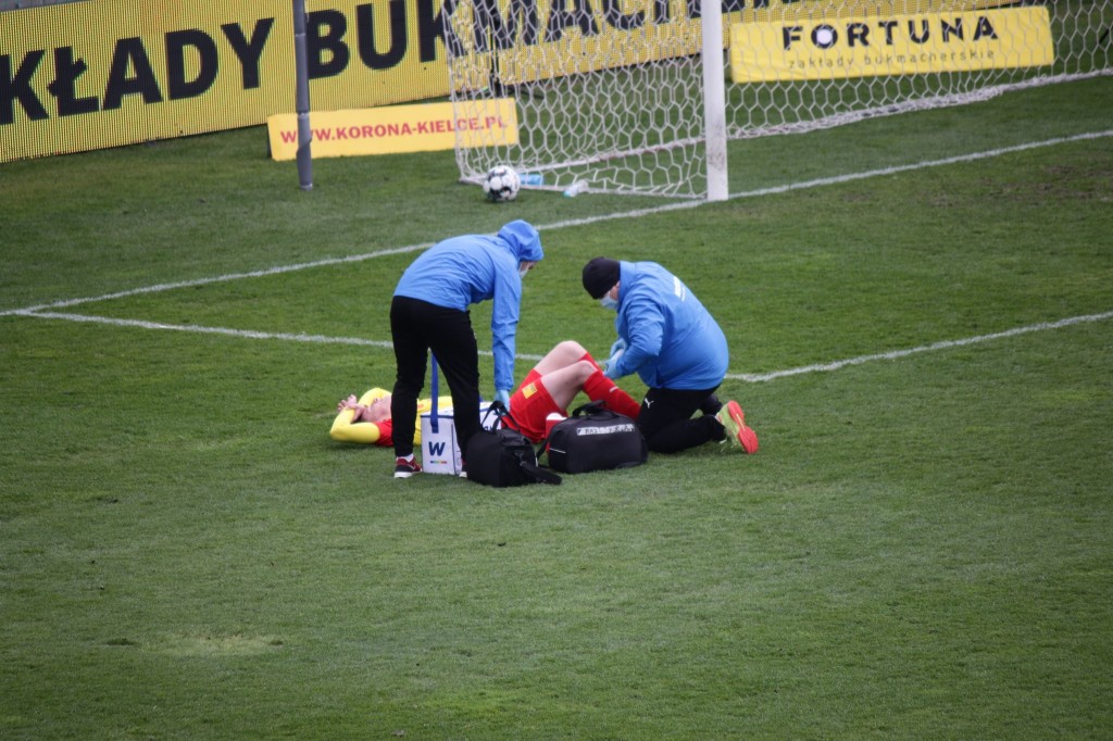Znowu gorąco pod bramką Korony! Rygaard nie trafił czysto w piłkę, a miał doskonałą sytuację! Piłkę wybijał Szymusik, który źle stanął i teraz cierpi, pomagają mu masażyści.