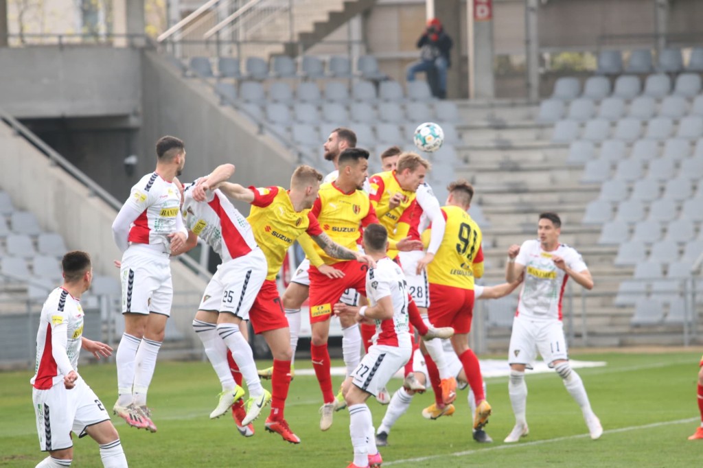 Wrzutka z lewej, główka, piłka spada pod nogi Sosnowca. Cały czas pod grą.
