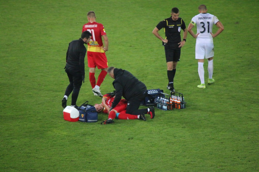 Ciekawe, co tam się wydarzyło. Jakub Górski leży. trzyma się za kolano. Opatrują go fizjoterapeuci. Pierwsza reakcja to, że konieczna będzie zmiana.