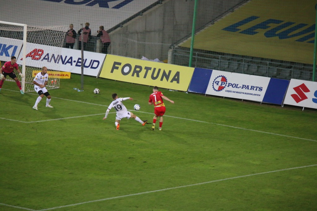 Piła szaleje na lewym skrzydle. Oszukał kieleckich obrońców, podał do Lebedyńskiego tyłem ustawionego do bramki. Próbuje się zebrać do tej piłki, ale ta ucieka mu spod nóg. Było niebezpiecznie, niemniej jednak Korona wychodzi z tego cało.