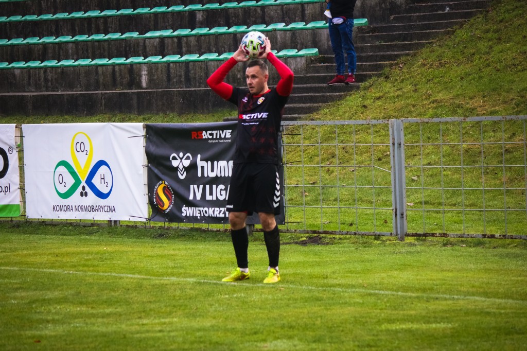 Chrobry próbuje wrzucić, ale czyści to na boku kielecki zespół. Będzie aut. Z narożnika obok karetki.