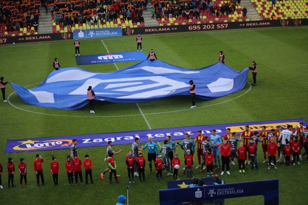 Lechia prowadzi grę, wrzuca, a Korona wybija.