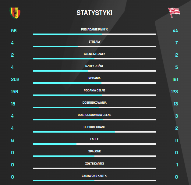 Cracovia - najwyższa celność strzałów oddanych (42,9% - 6 z 14) i strzałów z pola karnego (55,6% - 5 z 9)