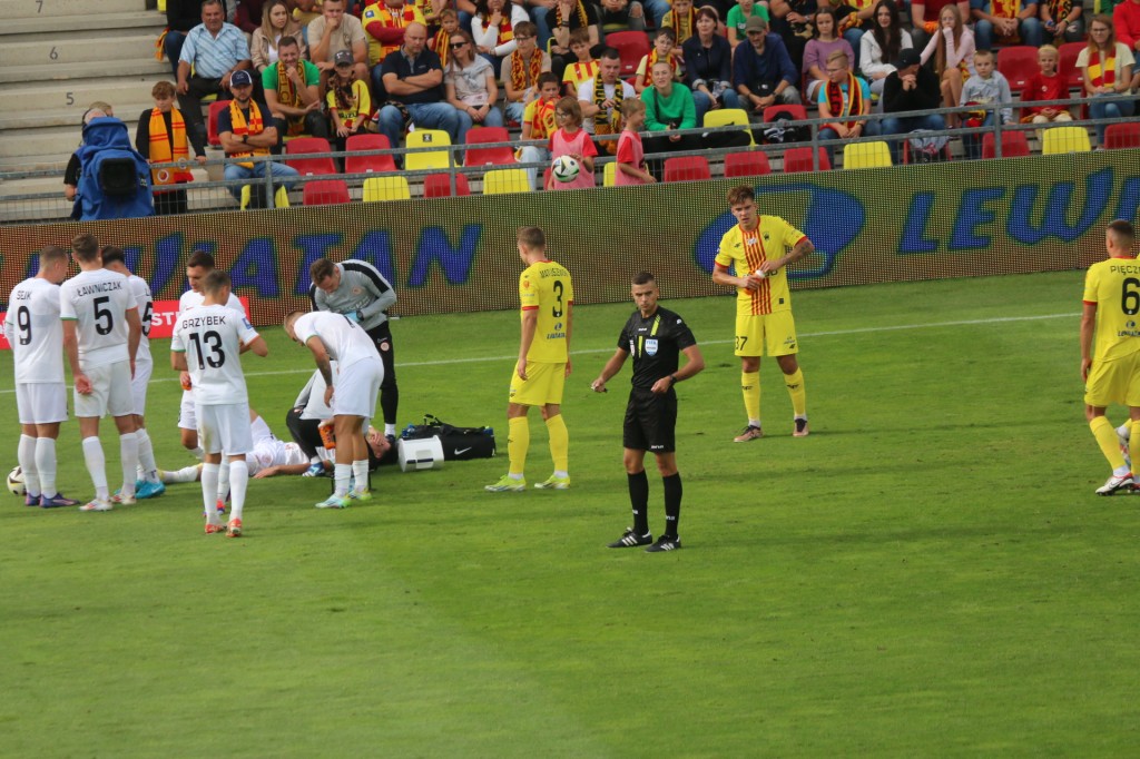 Kajetan Szmyt leży. Może być poważnie. Trojak wylądował na okolicach jego głowy. Piłkarz trzyma się za szyję albo obojczyk - ciężko z tej perspektywy stwierdzić.