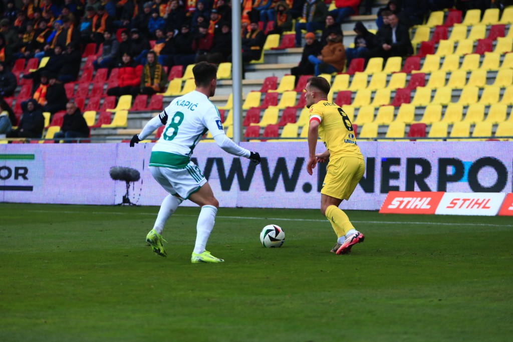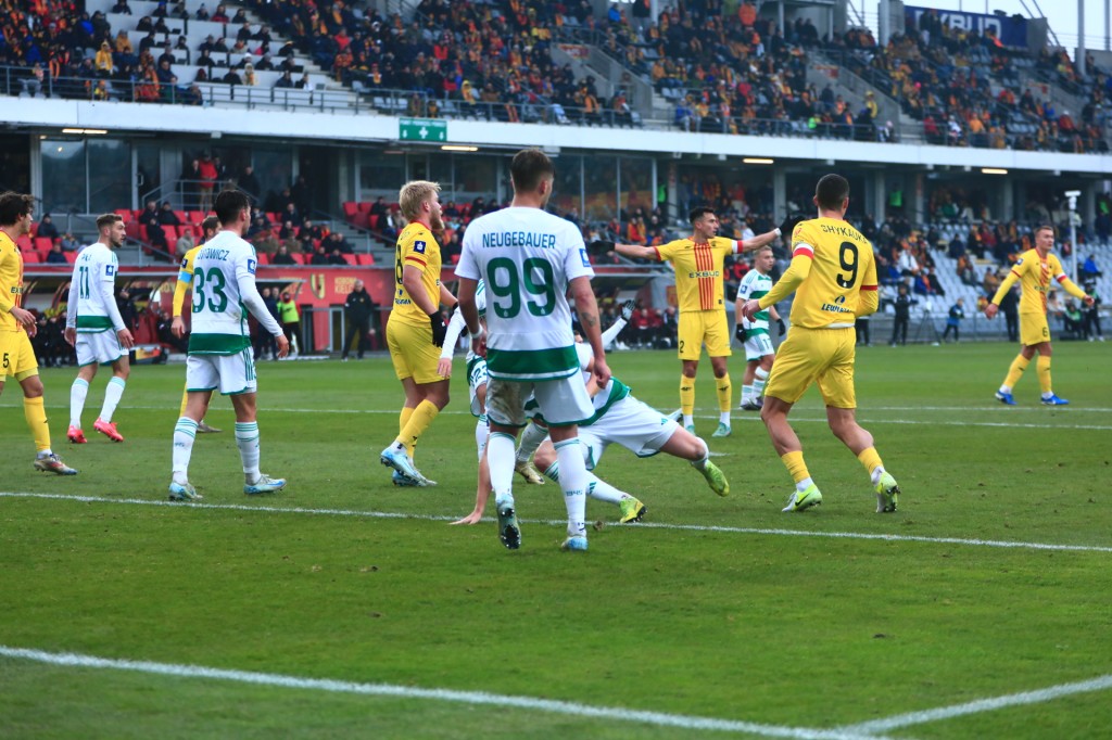 Teraz Białorusin miał okazję na strzał, ale został zablokowany, dobra akcja po rzucie wolnym, dogranie do Fornalczyka, który posłał wrzutkę w pole karne przyjezdnych