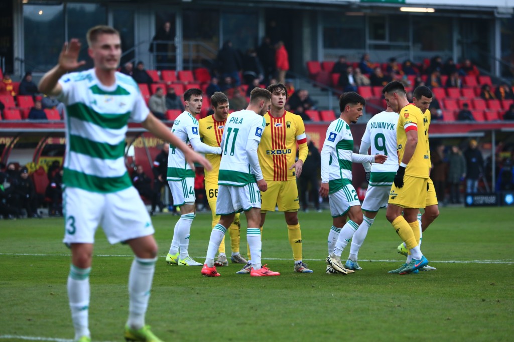 Teraz Lechia. Dośrodkowanie na pole karne Dziekońskiego, Zatora przeskoczył o dwie głowy niższy Maksym Khłań... ale jego zgrania nikt nie wykorzystał