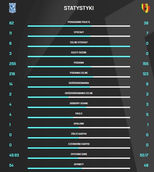 Sędzia Piotr Lasyk zakończył mecz 1:1. Był to bardzo dobry mecz „żółto-czerwonych” na obiekcie mistrza Polski. Stracona bramka to kunszt indywidualności, które „niebiesko-biali” mają zdecydowanie lepsze. Było blisko ale lepszy rydz niż nic