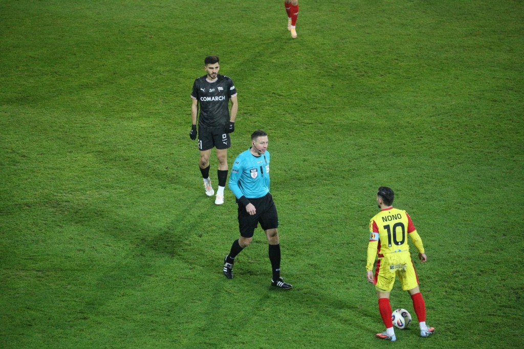 Nono szaleje, próbuje kiwać się z całą armią rywali. Tym razem skutkuje to ręką z jego strony. Cracovia robi szybkie wznowienie i gra przenosi sie na połowe Korony.