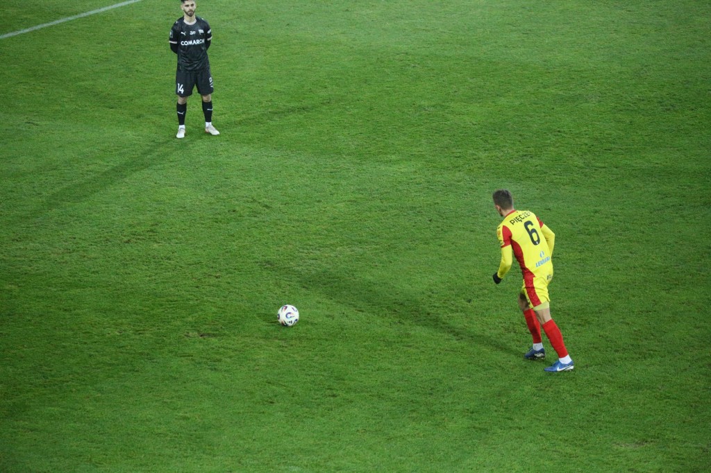 Korona przegrywa środek. Nie ma zbiórek w tej strefie. Pięczek próbuje przerzucić wszerz boisko, by podać do kolegi wychodzącego na skrzydle, jednak zabrakło petardy w nogach, a potem jeszcze przechwyt gosci.