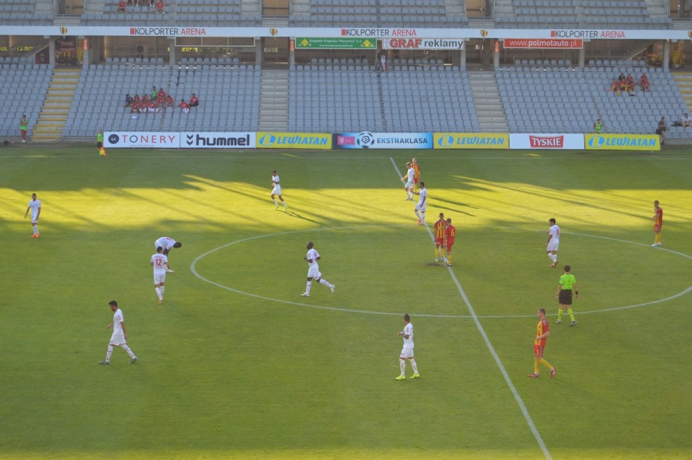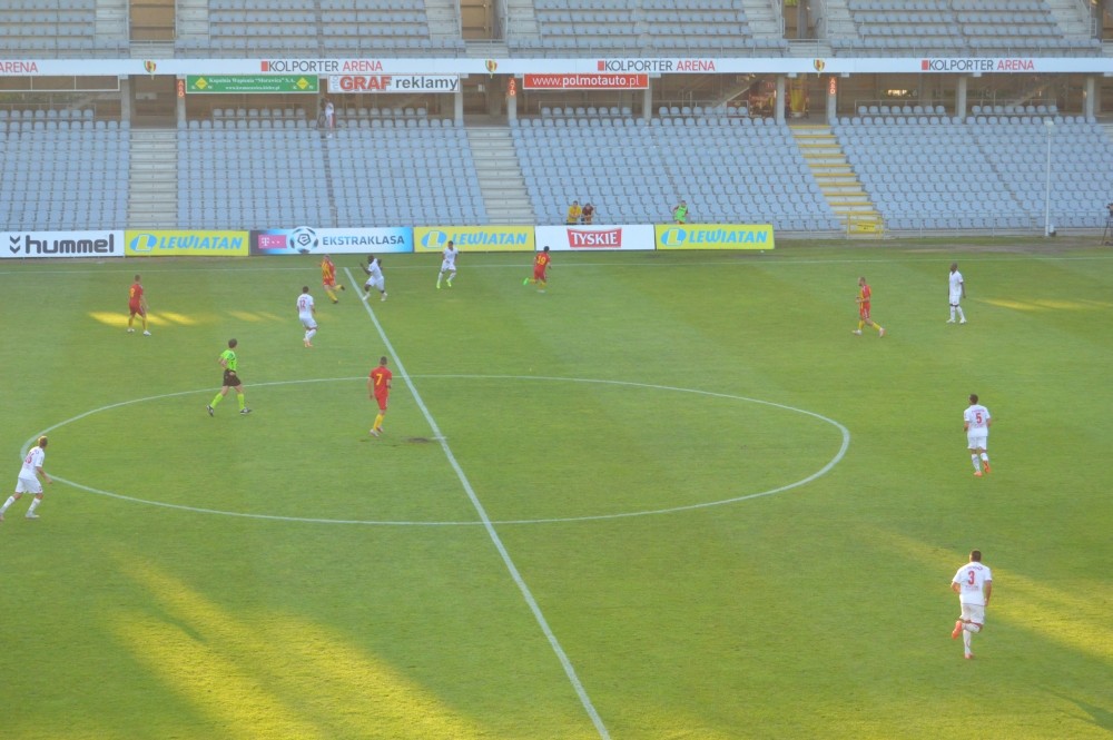 Rzut wolny dla Korony z lewego sektora boiska, ale centra Cebuli nie znajduje żadnego piłkarza żółto-czerwonych.
